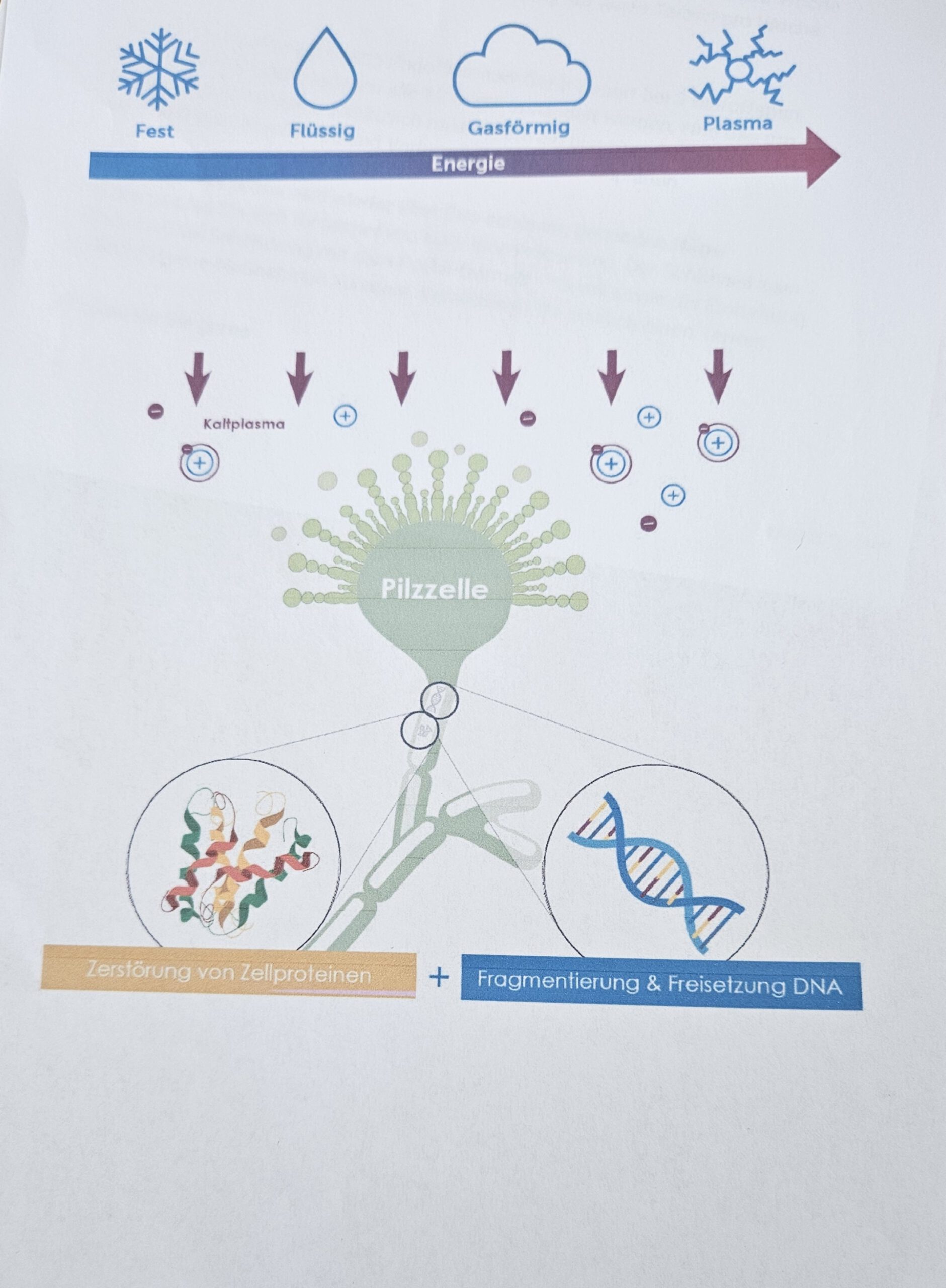 Die Aggregatzustände fest, flüssig und gasförmig sind jedermann bekannt. Plasma wird auch als „vierter Aggregatzustand der Materie“ bezeichnet. Es entsteht, wenn Gas noch weiter erhitzt wird. Natürliches, atmosphärisches Plasma etwa entsteht beispielsweise bei Blitzen. Solches Plasma wäre für eine Behandlung am Menschen natürlich viel zu heiß.
